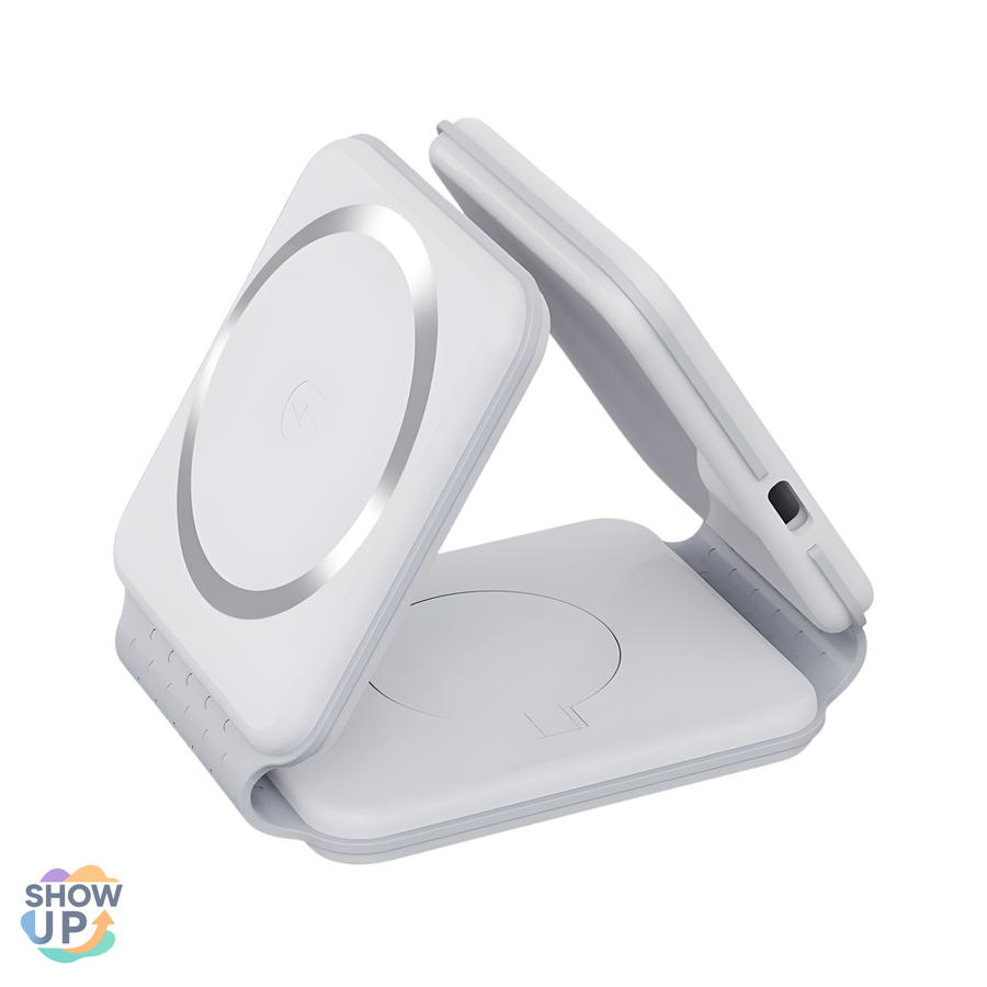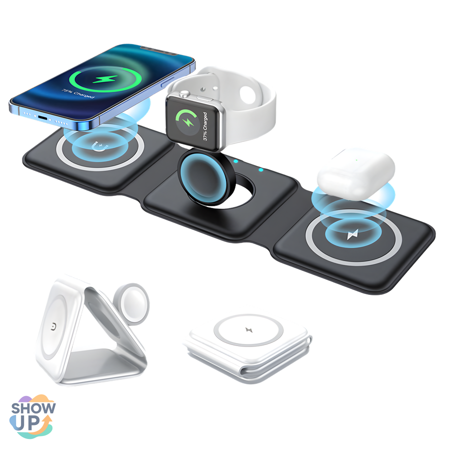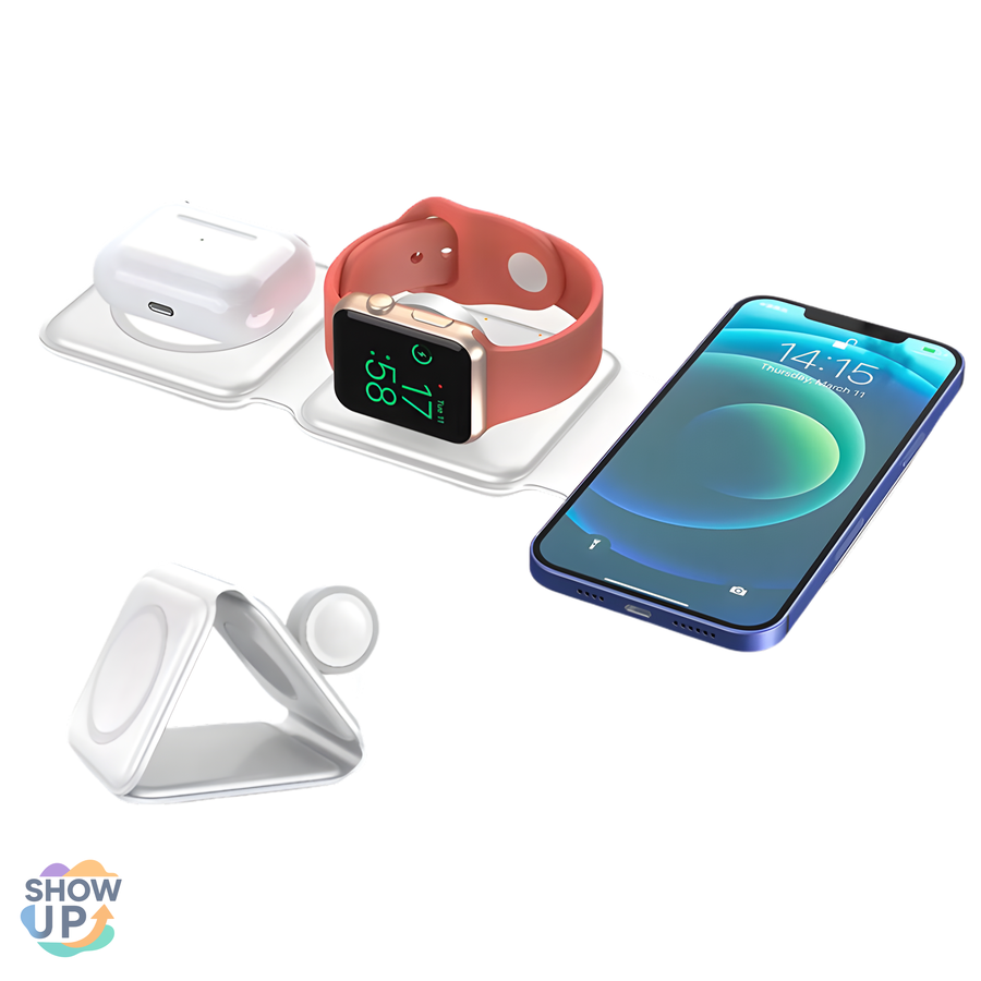شاحن لاسلكي 3 في 1 قابل للطي لشحن الهاتف والساعة والسماعة معًا بسرعة وأمان. تصميم أنيق وسهل الحمل، مثالي للسفر والاستخدام اليومي.