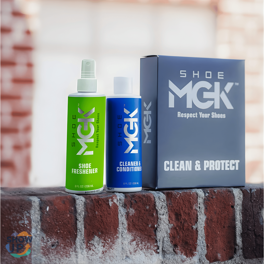 منظف وملمع الأحذية 2 في 1 MKG لإزالة الأتربة واستعادة اللمعان الفوري. مناسب لجميع أنواع الأحذية، سهل الاستخدام وآمن على الجلد. عبوة 125 مل × 2.
