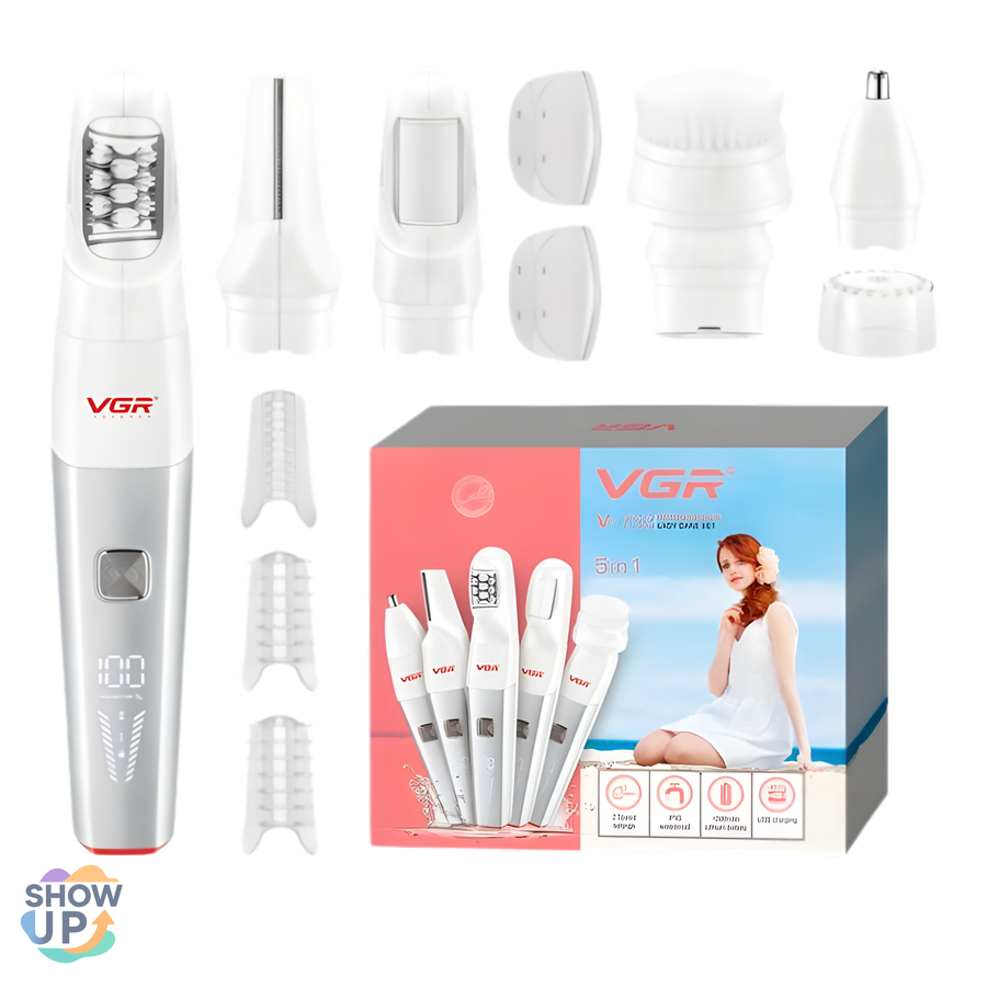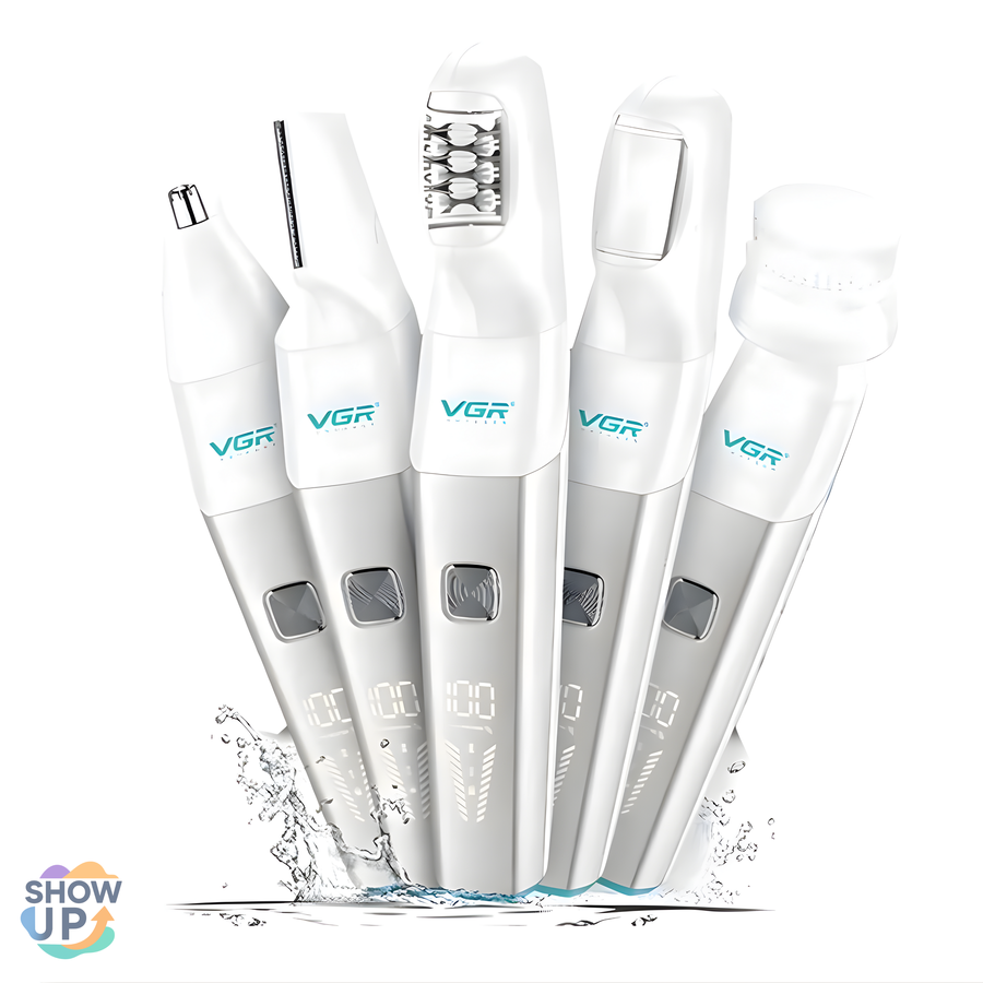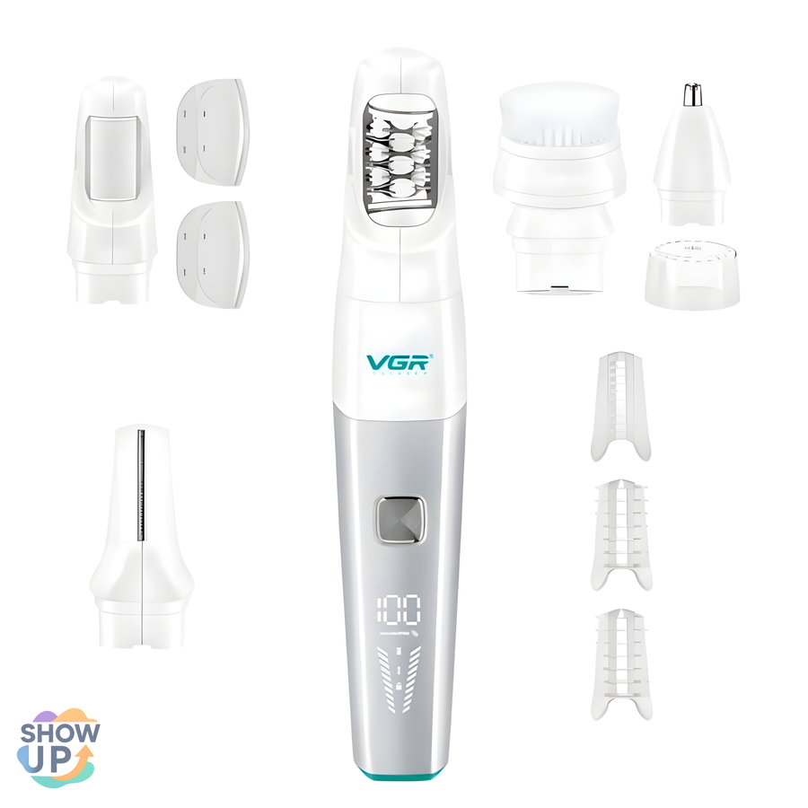 جهاز VGR V-752 بخمس رؤوس للعناية الكاملة – إزالة شعر، تشذيب، وتنظيف وجه. بطارية قوية، مقاوم للماء، وسهل الاستخدام أينما كنتِ.